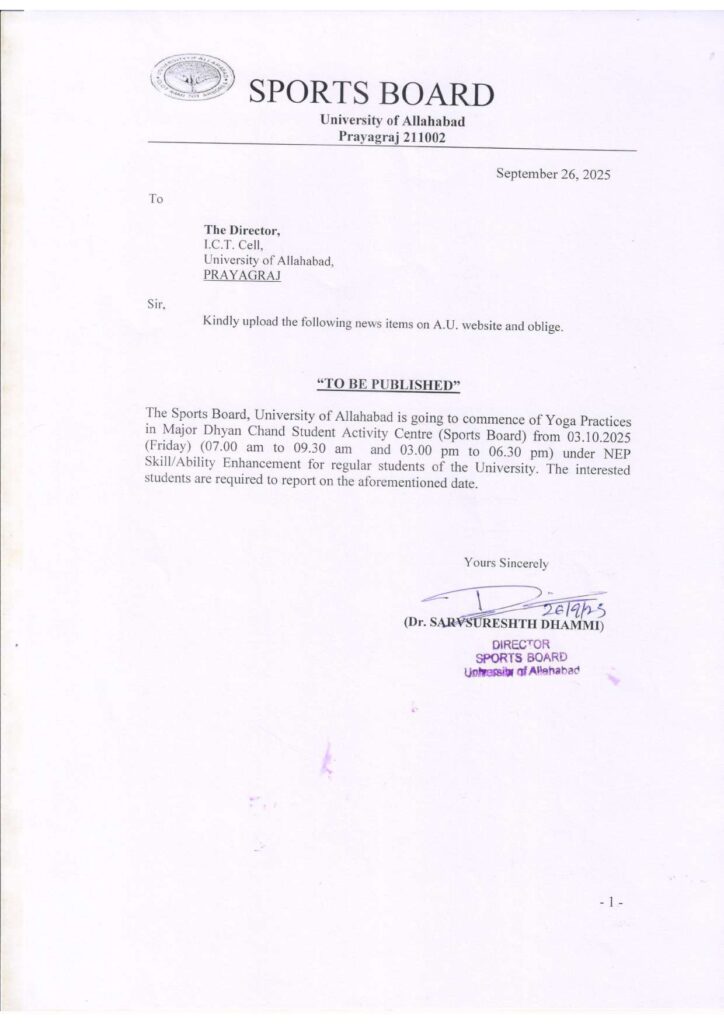 The Sports Board, University of Allahabad, has announced the commencement of Yoga Practices for students under the National Education Policy (NEP) 2020. The programme will be held at the Major Dhyan Chand Student Activity Centre (Sports Board) starting from October 3, 2025 (Friday).